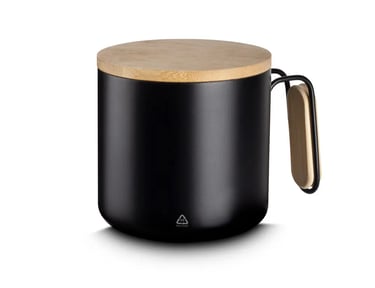 Caneca térmica aço inox com parede dupla, tampa e alça de bambu, 380ml.