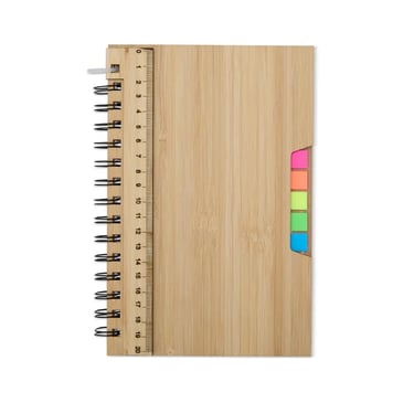 Caderno capa de bambu,68 folhas pautadas, 5 marcadores plásticos autoadesivos e uma régua de bambu de 20 cm. 20,9x14,8 x1,5 cm