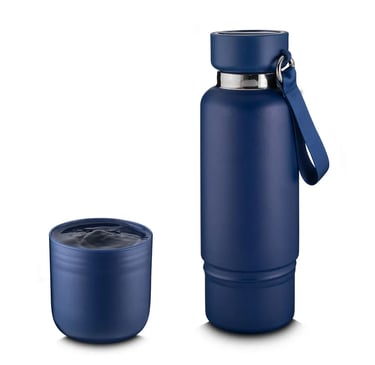 Garrafa térmica aço inox 500ml. Parte superior da tampa possui um compartimento para pequenos objetos, copo adicional na parte inferior da garrafa de 250ml. 26Xø7cm