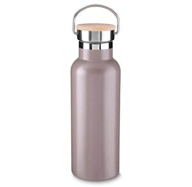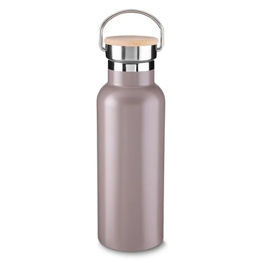 Garrafa térmica aço inox com parede dupla, 500ml. Revestimento em fibra de bambu. 22xø7,2cm