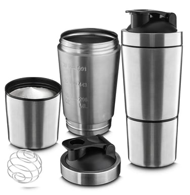 Garrafa coqueteleira aço inox para proteína 750ml, copo 200ml, acompanha mola para mistura e medidor gravado na parede da garrafa. 24xø9cm
