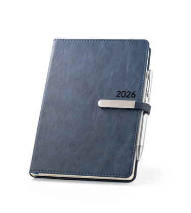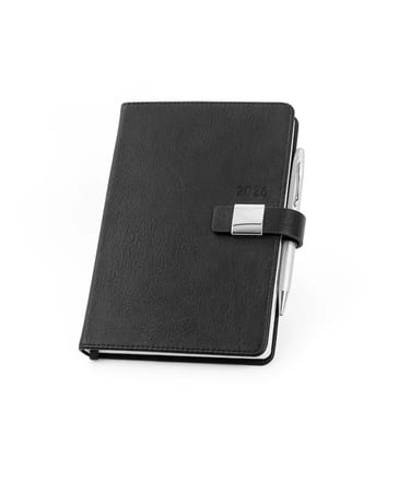 Agenda A5 em PU, esferográfica (inclusa). Organizada plano diário. 148 x 210 mm com bolsa de non-woven.