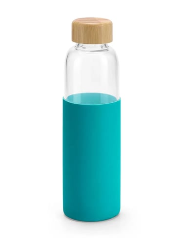 Garrafa vidro borossilicato, tampa bambu. Revestido luva silicone, 600 mL. ø68 x 231 mm